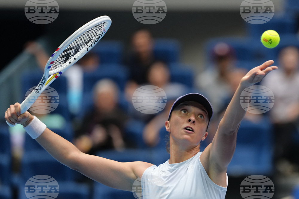 Iga Swiatek, of Poland tosses the ball to serve against Yuan Yue, of China during the women's singles match for the China Open tennis tournament, at the National Tennis Center, in Beijing, Saturday, Sept. 27, 2025. (AP Photo/Andy Wong)