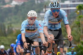 Belgium's Tim Rex, right, pedals during the men's Under 23 road race, at the road cycling World Championships in Kigali, Rwanda, Friday, Sept. 26, 2025. (AP Photo/Jerome Delay)