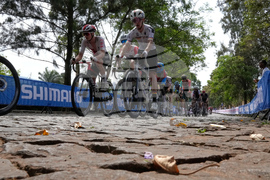 Riders pedal past spectators during the men's Under 23 road race, at the road cycling World Championships in Kigali, Rwanda, Friday, Sept. 26, 2025. (AP Photo/Jerome Delay)