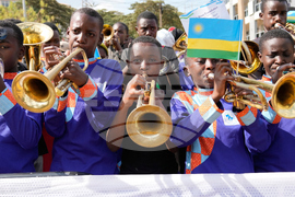 Boys play trumpets as the follow the men's Under 23 road race, at the road cycling World Championships in Kigali, Rwanda, Friday, Sept. 26, 2025. (AP Photo/Jerome Delay)
