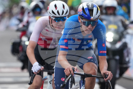 Italy's Mark Lorenzo Finn, right, leads Swit'zerland's Jan Huber during the men's Under 23 road race, at the road cycling World Championships in Kigali, Rwanda, Friday, Sept. 26, 2025. (AP Photo/Jerome Delay)