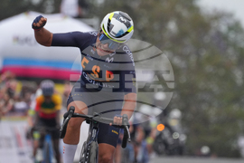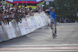 Italy's Mark Lorenzo Finn celebrates as he approaches the finish line to win the men's Under 23 road race, at the road cycling World Championships in Kigali, Rwanda, Friday, Sept. 26, 2025. (AP Photo/Jerome Delay)
