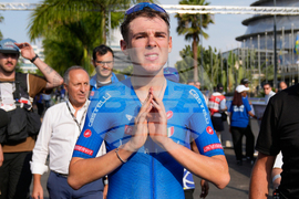 Italy's Lorenzo Mark Finn bites the gold medal of the men's Under 23 road race, at the road cycling World Championships in Kigali, Rwanda, Friday, Sept. 26, 2025. (AP Photo/Jerome Delay)
