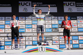 Italy's Lorenzo Mark Finn, center, winner of the men's Under 23 road race, bites the gold medal flanked by silver medallist Switzerland's Jan Huber, left, and bronze medallist Austria's Marco Schrettl, at the road cycling World Championships in Kigali, Rwanda, Friday, Sept. 26, 2025. (AP Photo/Jerome Delay)