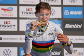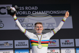 Italy's Lorenzo Mark Finn celebrates on the podium after winning the gold medal of the men's Under 23 road race, at the road cycling World Championships in Kigali, Rwanda, Friday, Sept. 26, 2025. (AP Photo/Jerome Delay)