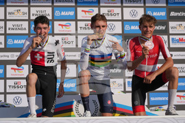 Italy's Lorenzo Mark Finn, center, winner of the men's Under 23 road race, is flanked by second placed Switzerland's Jan Huber, left, and third placed Austria's Marco Schrettl, at the road cycling World Championships in Kigali, Rwanda, Friday, Sept. 26, 2025. (AP Photo/Jerome Delay)