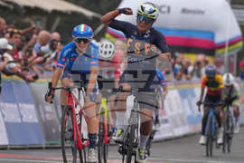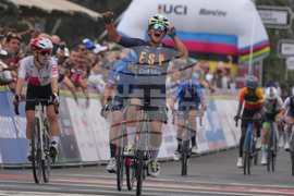 Spain's Paula Ostiz Taco celebrates as she sprints ahead of Italy's Chantal Pegolo, left, to win the women's Junior road race, at the road cycling World Championships in Kigali, Rwanda, Saturday, Sept. 27, 2025. (AP Photo/Jerome Delay)