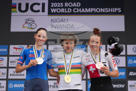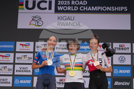 Spain's Paula Ostiz Taco, center, winner of the women's Junior road race, poses on the podium with silver medal's winner Italy's Chantal Pegolo, left, and bronze medal's winner Switzerland's Anja Grossmann, at the road cycling World Championships in Kigali, Rwanda, Saturday, Sept. 27, 2025. (AP Photo/Jerome Delay)