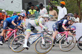 Riders make their way during the women's Elite road race, at the road cycling World Championships in Kigali, Rwanda, Saturday, Sept. 27, 2025. (AP Photo/Jerome Delay)