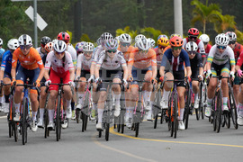 Competitors at the start of the women's Elite road race, at the road cycling World Championships in Kigali, Rwanda, Saturday, Sept. 27, 2025. (AP Photo/Jerome Delay)