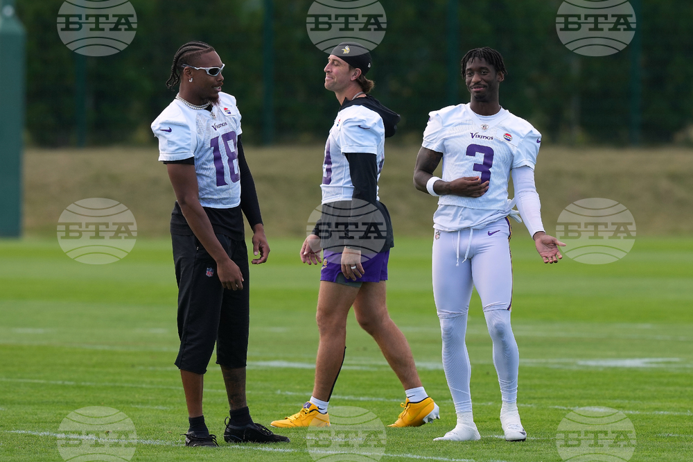Minnesota Vikings players warm up during a training session ahead of their match against Pittsburgh Steelers in Dublin, Friday, Sept. 26, 2025.(AP Photo/Frank Augstein)