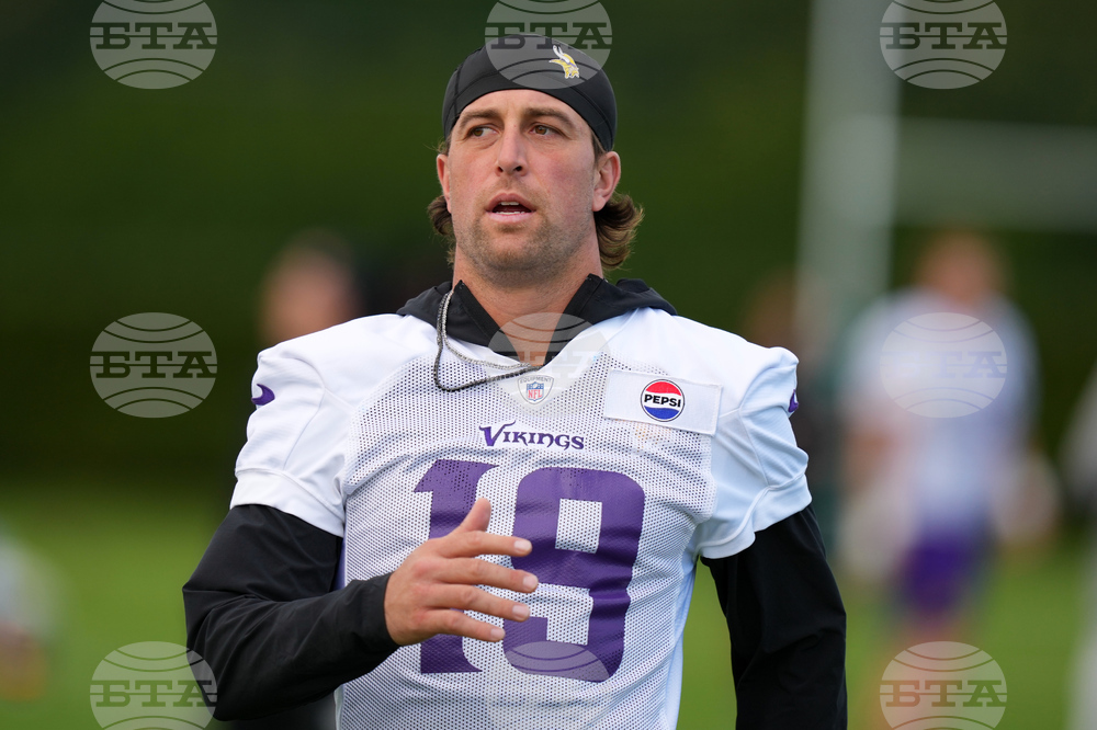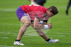 Minnesota Vikings quarterback Max Brosmer (12) stretches during a training session ahead of their match against Pittsburgh Steelers in Dublin, Friday, Sept. 26, 2025.(AP Photo/Frank Augstein)