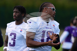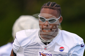 Minnesota Vikings wide receiver Jordan Addison (3) warms up during a training session ahead of their match against Pittsburgh Steelers in Dublin, Friday, Sept. 26, 2025.(AP Photo/Frank Augstein)