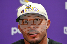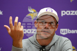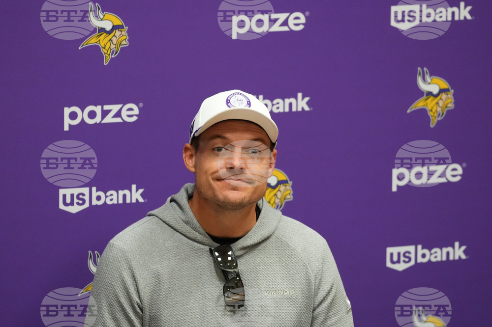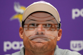 Minnesota Vikings head coach Kevin O'Connell reacts during a press conference ahead of their match against Pittsburgh Steelers in Dublin, Friday, Sept. 26, 2025.(AP Photo/Frank Augstein)