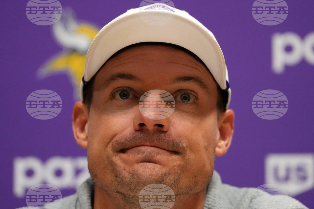 Minnesota Vikings head coach Kevin O'Connell gestures during a press conference ahead of their match against Pittsburgh Steelers in Dublin, Friday, Sept. 26, 2025.(AP Photo/Frank Augstein)