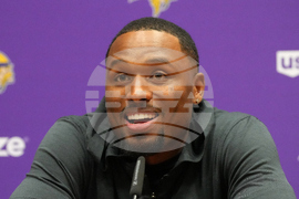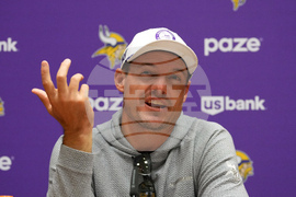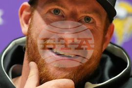 Minnesota Vikings quarterback Carson Wentz (11) reacts during a press conference ahead of their match against Pittsburgh Steelers in Dublin, Friday, Sept. 26, 2025.(AP Photo/Frank Augstein)