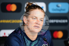 Canada head coach Kevin Rouet speaking at a press conference at the Allianz Stadium, London, Friday Sept. 26, 2025, a day ahead of facing England in the final match of the Women's Rugby World Cup. (Ben Whitley/PA via AP)