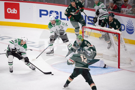Minnesota Wild's defender Jack Johnson (3), Dallas Stars' forward Adam Erne (76) and Minnesota Wild goaltender Jesper Wallstedt (30)all watch a bouncing puck during the second period of an NHL preseason hockey game, Thursday, Sept. 25, 2025, at Grand Casino Arena in St. Paul, Minn. (Jeff Wheeler/Star Tribune via AP)
