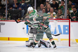 Minnesota Wild goaltender Samuel Hlavaj (35) tries to glove a puck before Minnesota Wild right wing Danila Yurov (22) could get the rebound in the third period the third period of an NHL preseason hockey game, Thursday, Sept. 25, 2025, at Grand Casino Arena in St. Paul, Minn. (Jeff Wheeler/Star Tribune via AP)