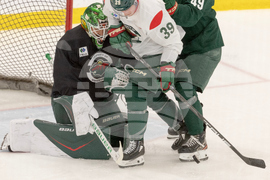 Minnesota Wild goalie Samuel Hlavaj (35) defends the net during NHL hockey training camp at Tria Rink in St. Paul, Minn., Thursday, Sept. 18, 2025. (Carlos Gonzalez/Star Tribune via AP)