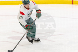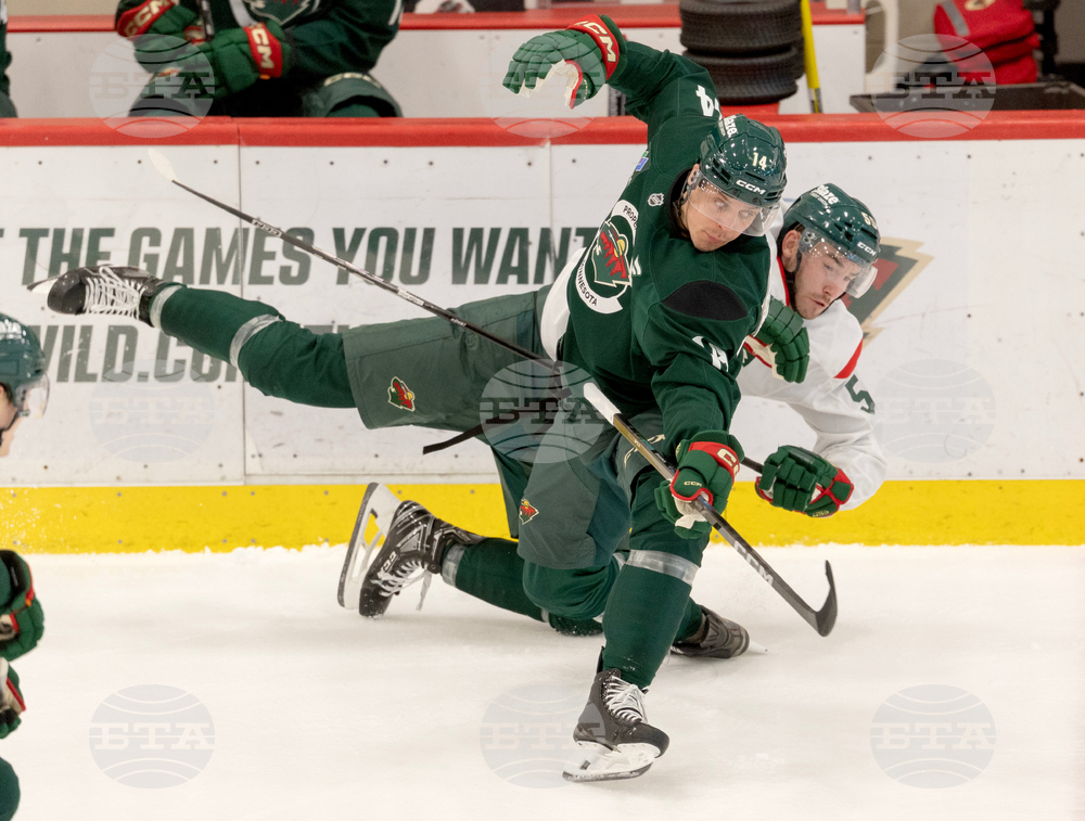 Minnesota Wild's Brett Leason (20) skates during NHL hockey training camp at Tria Rink in St. Paul, Minn., Thursday, Sept. 18, 2025. (Carlos Gonzalez/Star Tribune via AP)