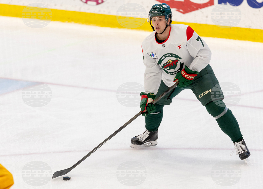Minnesota Widl's Brock Faber (7) looks to pass during NHL hockey training camp at Tria Rink in St. Paul, Minn., Thursday, Sept. 18, 2025. (Carlos Gonzalez/Star Tribune via AP)