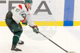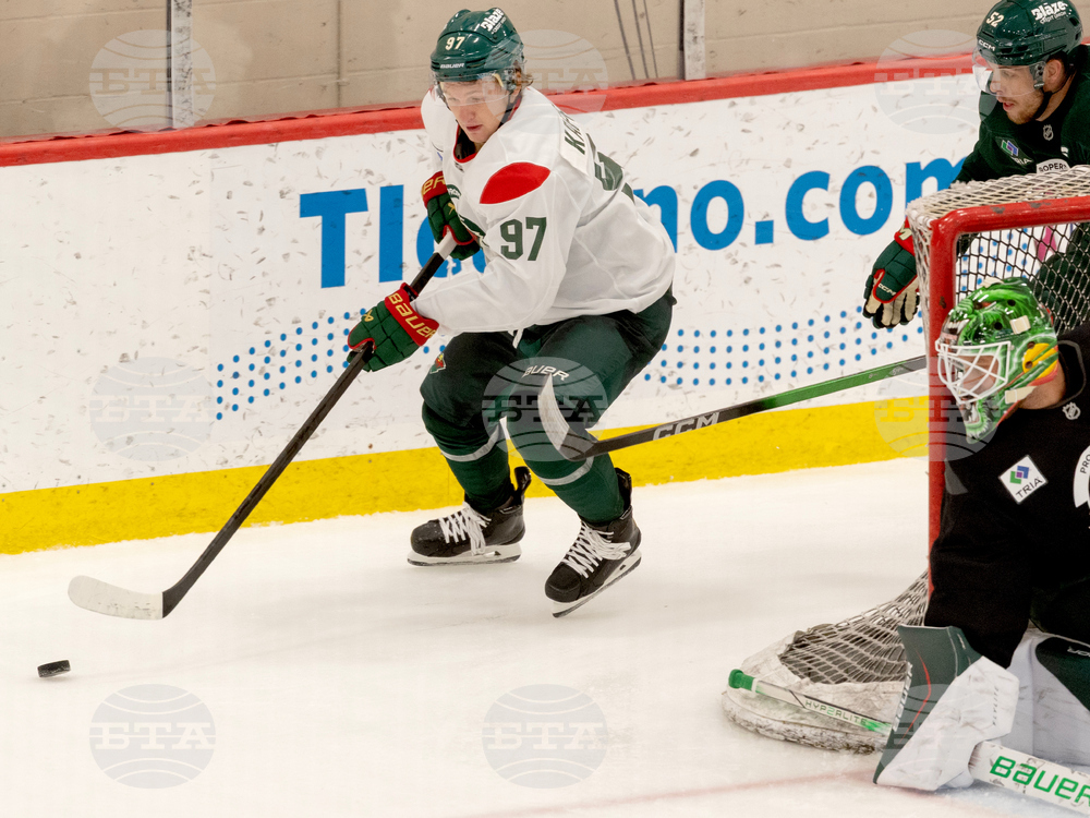 Minnesota Wild's Kirill Kaprizov (97) skates with the puck during NHL hockey training camp at Tria Rink in St. Paul, Minn., Thursday, Sept. 18, 2025. (Carlos Gonzalez/Star Tribune via AP)