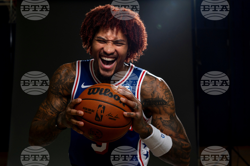 Philadelphia 76ers' Kelly Oubre Jr. pose for photos during the NBA basketball team's media day, Friday, Sept. 26, 2025, in Camden, N.J. (AP Photo/Chris Szagola)