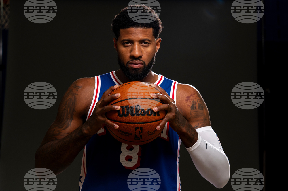 Philadelphia 76ers' Paul George pose for photos during the NBA basketball team's media day, Friday, Sept. 26, 2025, in Camden, N.J. (AP Photo/Chris Szagola)