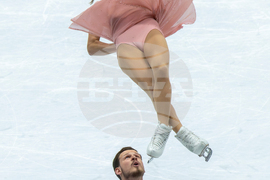 Alisa Efimova and Misha Mitrofanov from the United States perform in the pairs free skating program at the Nebelhorn Trophy figure skating competition, Friday, Sept. 26, 2025, in Oberstdorf, Germany. (Peter Kneffel/dpa via AP)