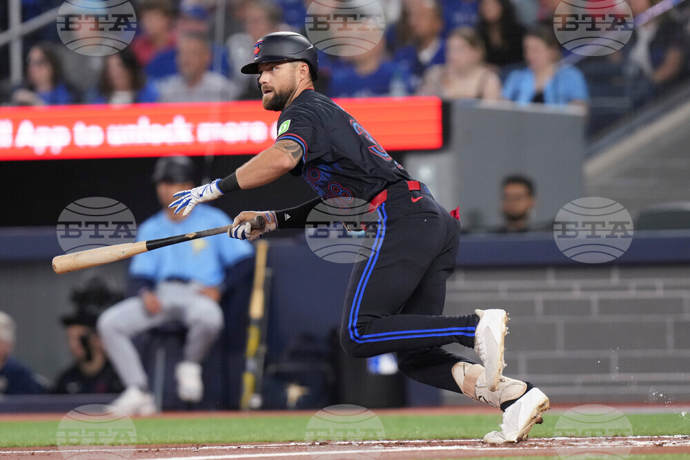 Toronto Blue Jays' Nathan Lukes (38) hits an RBI single off Tampa Bay Rays pitcher Adrian Houser during first inning MLB baseball action in Toronto on Friday, Sept. 26, 2025. (Chris Young/The Canadian Press via AP)