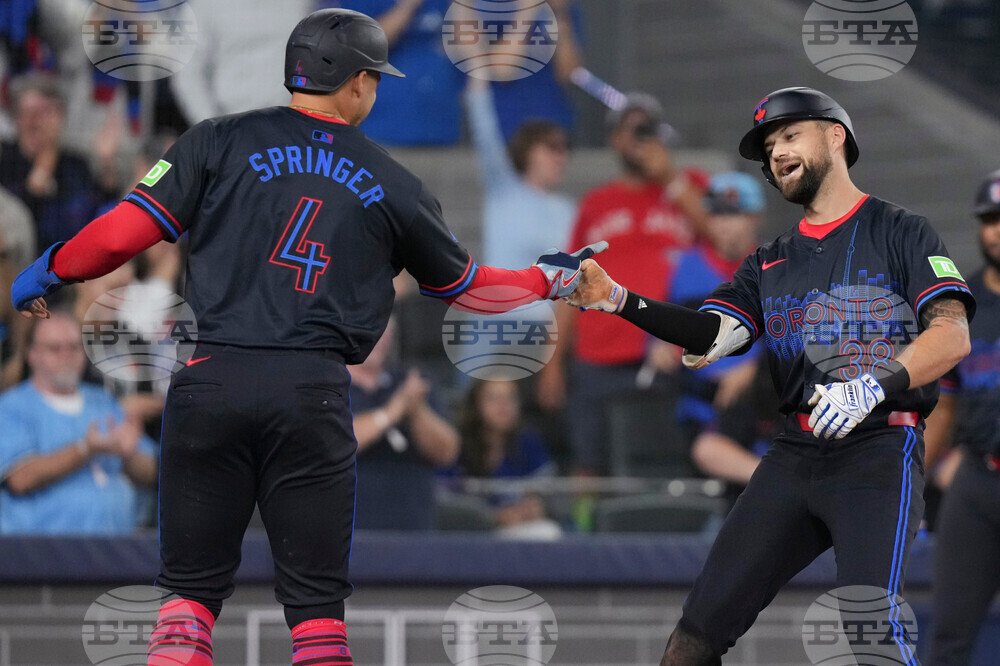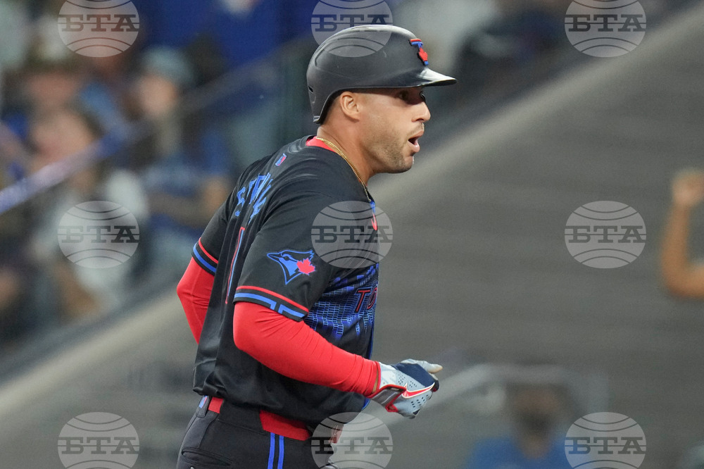 Toronto Blue Jays' George Springer celebrates after scoring on a Nathan Lukes RBI single off Tampa Bay Rays pitcher Adrian Houser during first inning MLB baseball action in Toronto on Friday, Sept. 26, 2025. (Chris Young/The Canadian Press via AP)