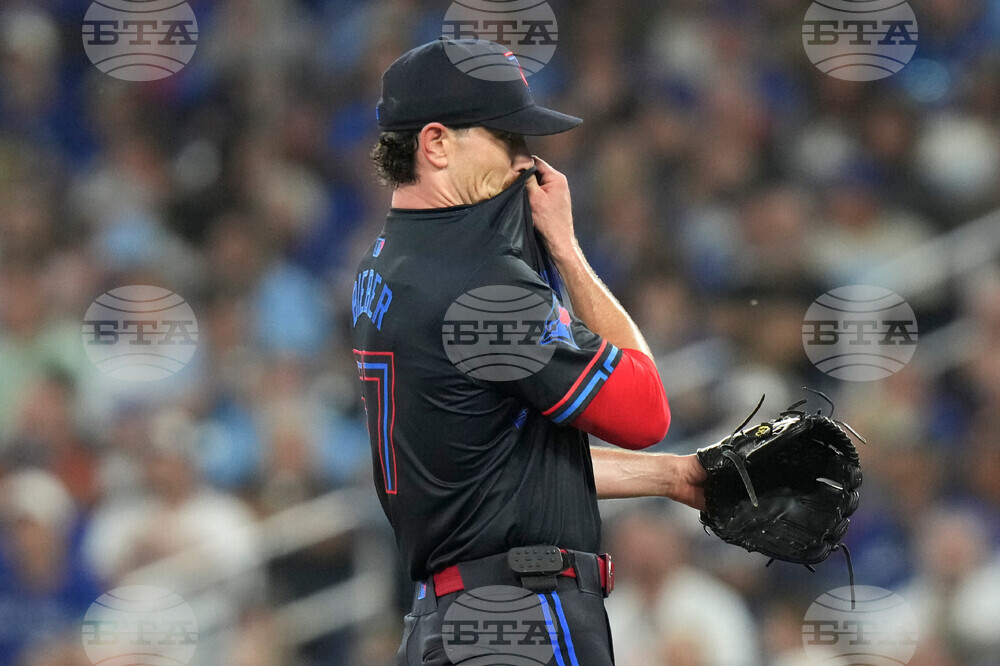 Toronto Blue Jays pitcher Shane Bieber reacts after Tampa Bay Rays' Jonathan Aranda hit a solo home run during second inning MLB baseball action in Toronto on Friday, September 26, 2025. (Chris Young/The Canadian Press via AP)