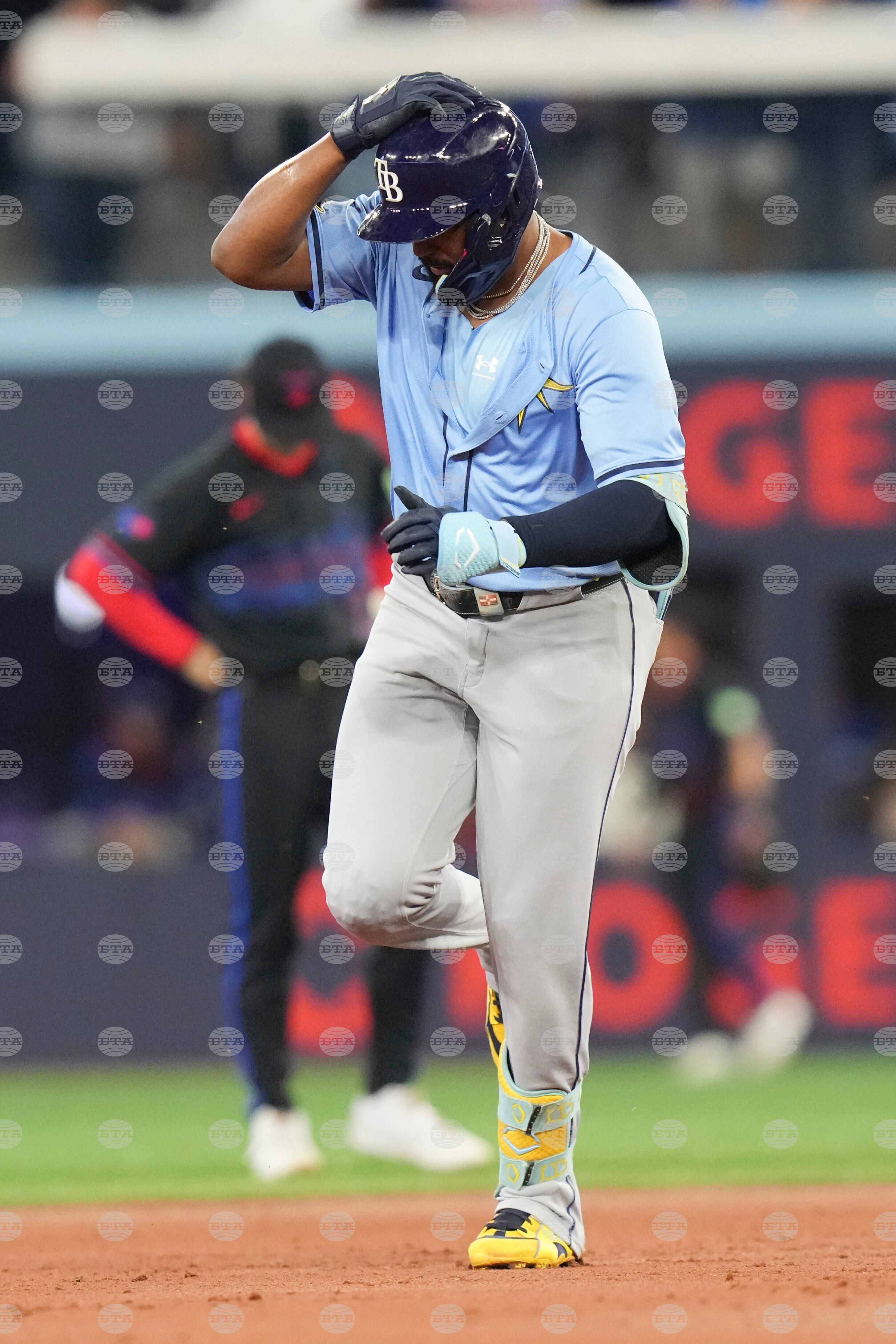 Tampa Bay Rays' Brandon Lowe (8) reacts as he stands at bat during eighth inning MLB baseball action against the Toronto Blue Jays in Toronto on Friday, Sept. 26, 2025. (Chris Young/The Canadian Press via AP)