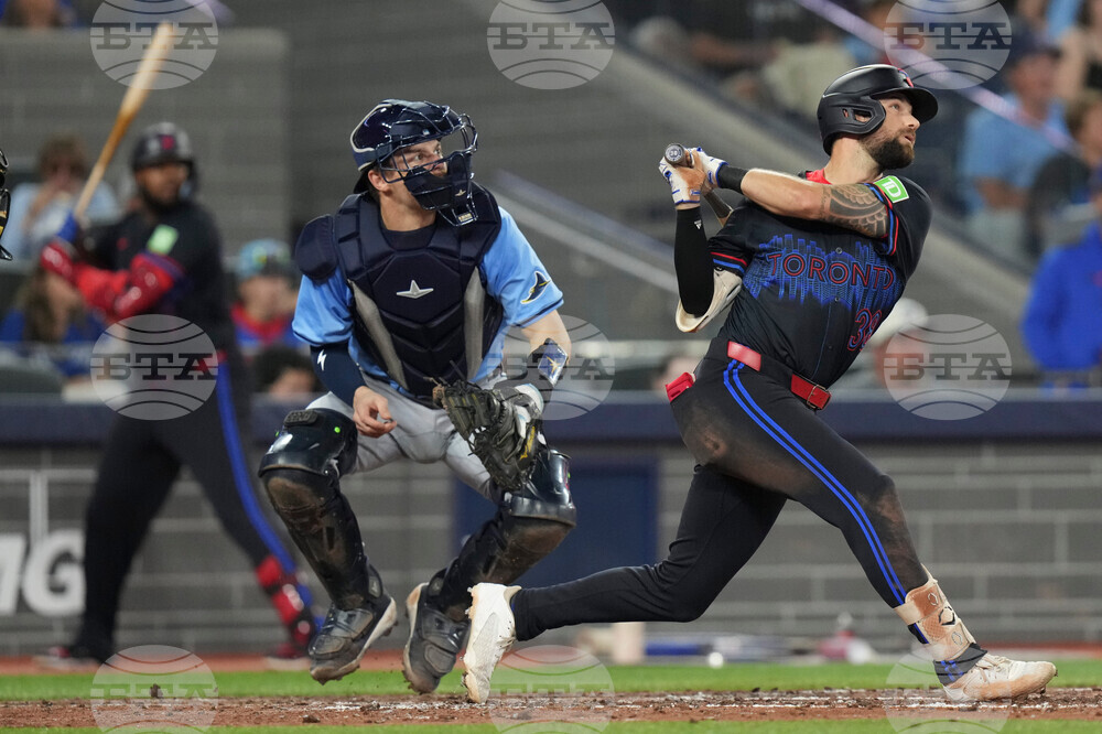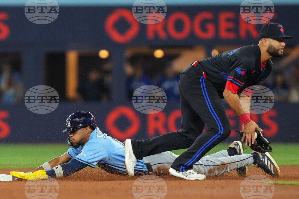 Tampa Bay Rays second baseman Brandon Lowe (8) and first baseman Bob Seymour (41) collide as they try to catch a foul ball from Toronto Blue Jays' Daulton Varsho during eighth inning MLB baseball action in Toronto on Friday, Sept. 26, 2025. (Chris Young/The Canadian Press via AP)