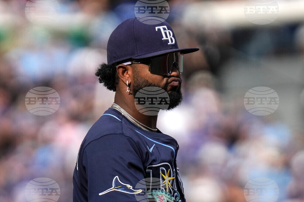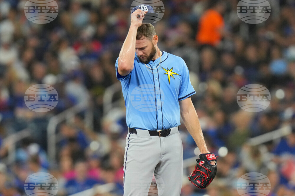 Tampa Bay Rays pitcher Adrian Houser (37) works against the Toronto Blue Jays during first inning MLB baseball action in Toronto on Friday, Sept. 26, 2025. (Chris Young/The Canadian Press via AP)