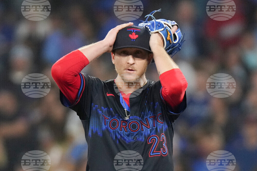Toronto Blue Jays pitcher Jeff Hoffman (23) reacts during ninth inning MLB baseball action against the Tampa Bay Rays in Toronto on Friday, September 26, 2025. (Chris Young/The Canadian Press via AP)