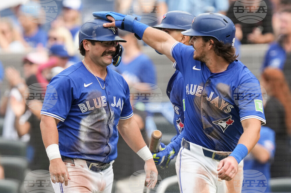 Toronto Blue Jays' Addison Barger (47) and Davis Schneider (36) celebrate after Jays' Ernie Clement hit a two-run double off Tampa Bay Rays pitcher Joe Boyle (36) during the second inning of a baseball game in Toronto, Saturday, Sept. 27, 2025. (Chris Young/The Canadian Press via AP)