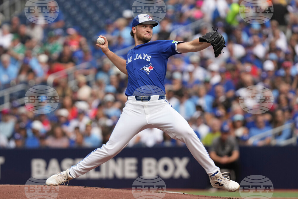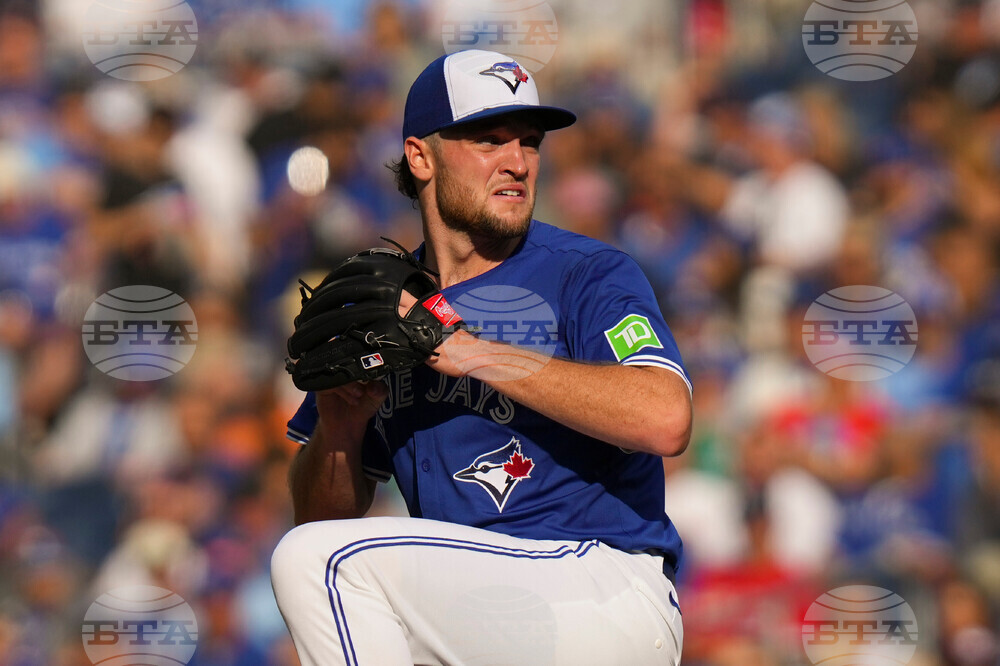 Toronto Blue Jays pitcher Trey Yesavage (39) works against the Tampa Bay Rays during first inning MLB baseball action in Toronto on Saturday September 27, 2025. (Chris Young/The Canadian Press via AP)