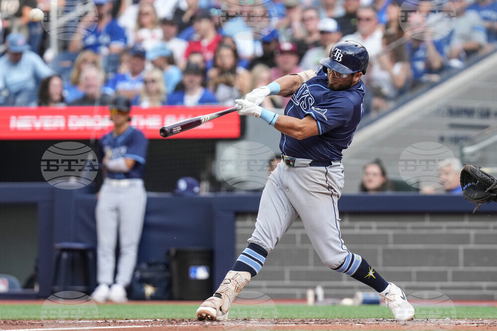 Tampa Bay Rays' Jonathan Aranda hits a solo home run off Toronto Blue Jays pitcher Yariel Rodriguez during the sixth inning of a baseball game, Saturday Sept. 27, 2025, in Toronto. (Chris Young/The Canadian Press via AP)
