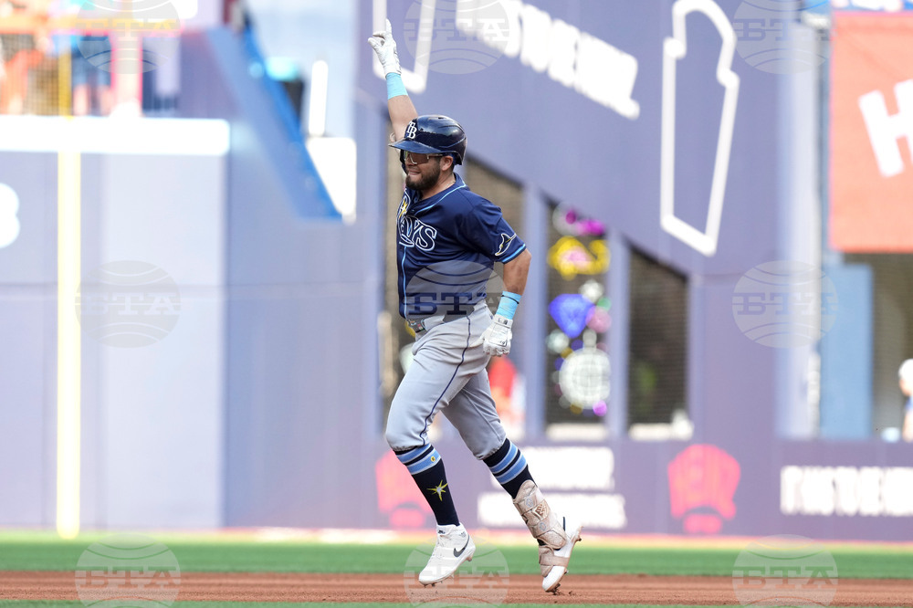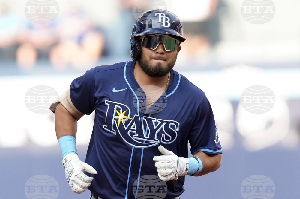 Tampa Bay Rays' Jonathan Aranda rounds the bases after hitting a solo home run off Toronto Blue Jays pitcher Yariel Rodriguez during the sixth inning of a baseball game, Saturday Sept. 27, 2025, in Toronto. (Chris Young/The Canadian Press via AP)