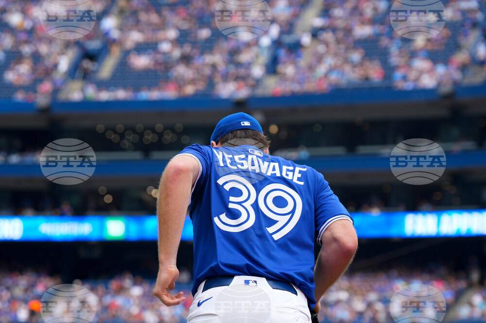 Toronto Blue Jays pitcher Trey Yesavage (39) runs onto the field to make his home field debut prior to first inning MLB baseball action against against the Tampa Bay Rays in Toronto on Saturday September 27, 2025. (Chris Young/The Canadian Press via AP)