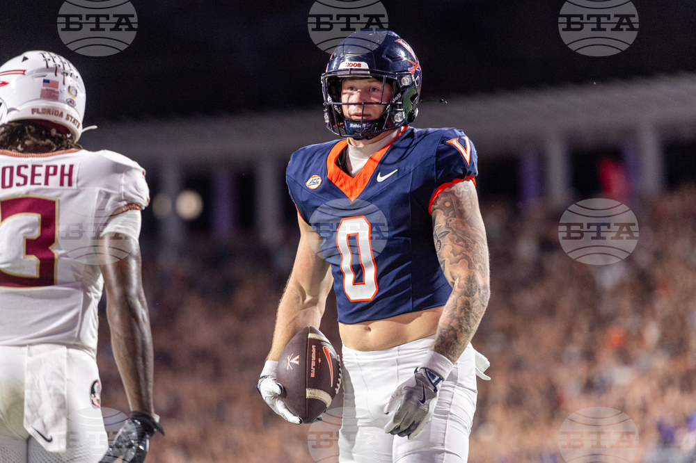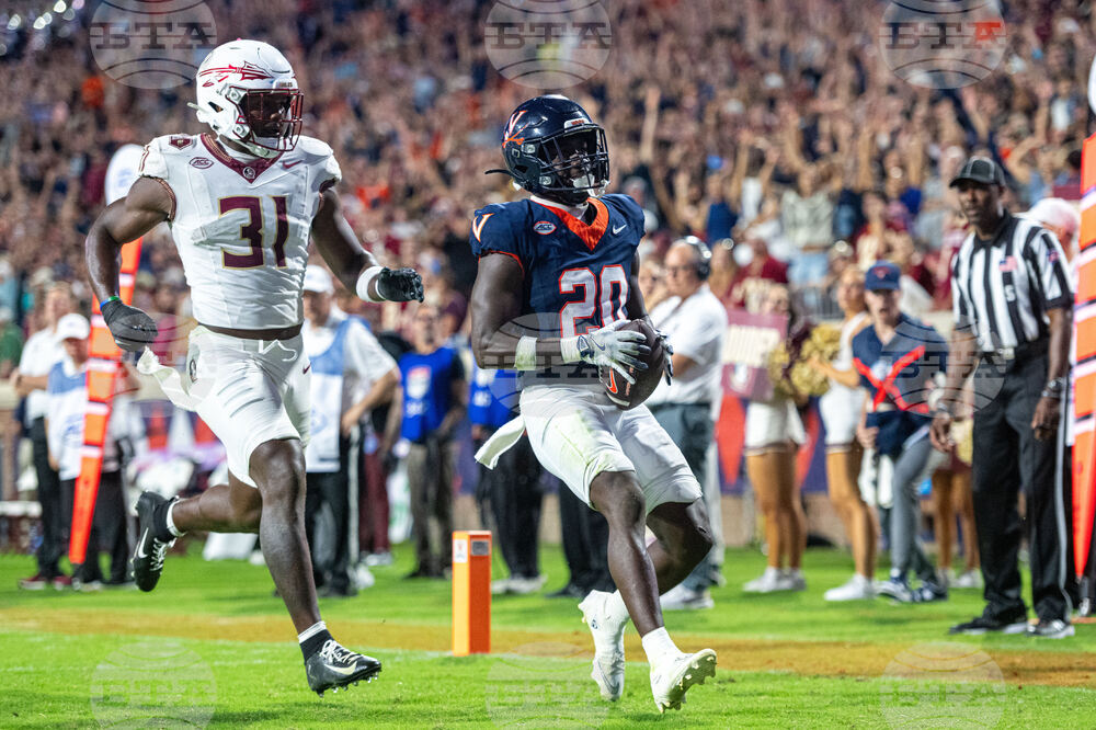 Virginia running back Xavier Brown (20) receives the ball for a touchdown during the second half of an NCAA college football game, Friday, Sept. 26 2025, in Charlottesville, Va. (AP Photo/Robert Simmons)