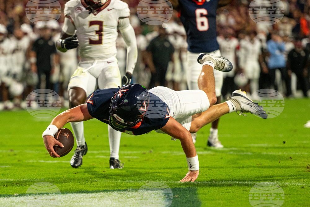 Virginia quarterback Chandler Morris (4) runs the ball in for a touchdown during the first half of an NCAA college football game, Friday, Sept. 26, 2025, in Charlottesville, Va. (AP Photo/Robert Simmons)