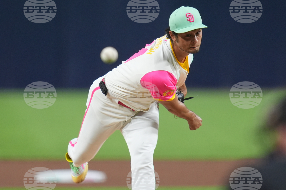 San Diego Padres starting pitcher Yu Darvish works against an Arizona Diamondbacks batter during the first inning of a baseball game Friday, Sept. 26, 2025, in San Diego. (AP Photo/Gregory Bull)