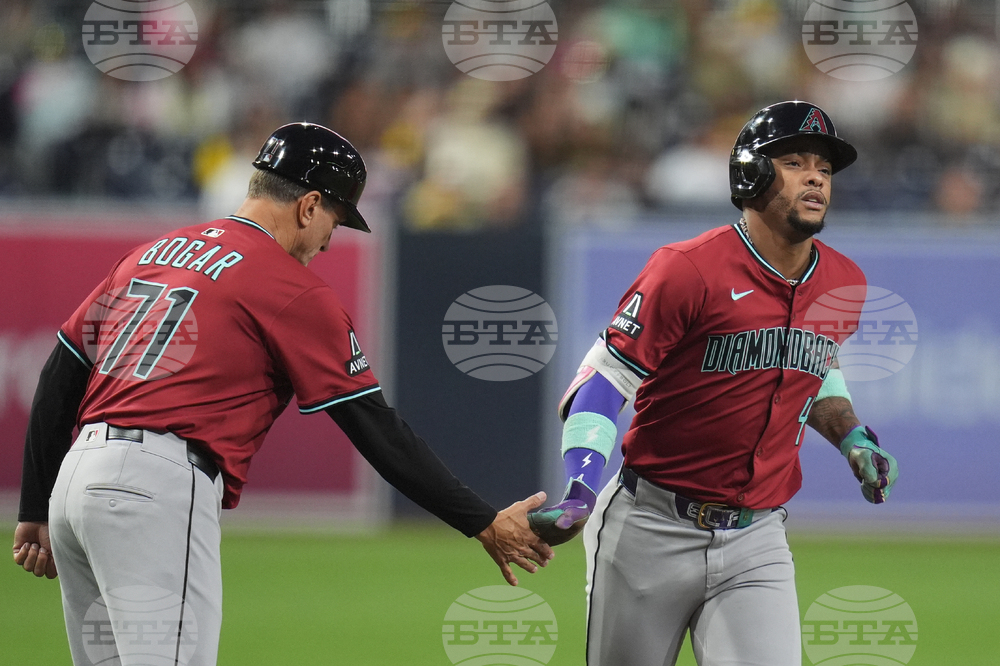 Arizona Diamondbacks' Ketel Marte, right, celebrates with teammate Corbin Carroll after hitting a home run during the first inning of a baseball game against the San Diego Padres Friday, Sept. 26, 2025, in San Diego. (AP Photo/Gregory Bull)