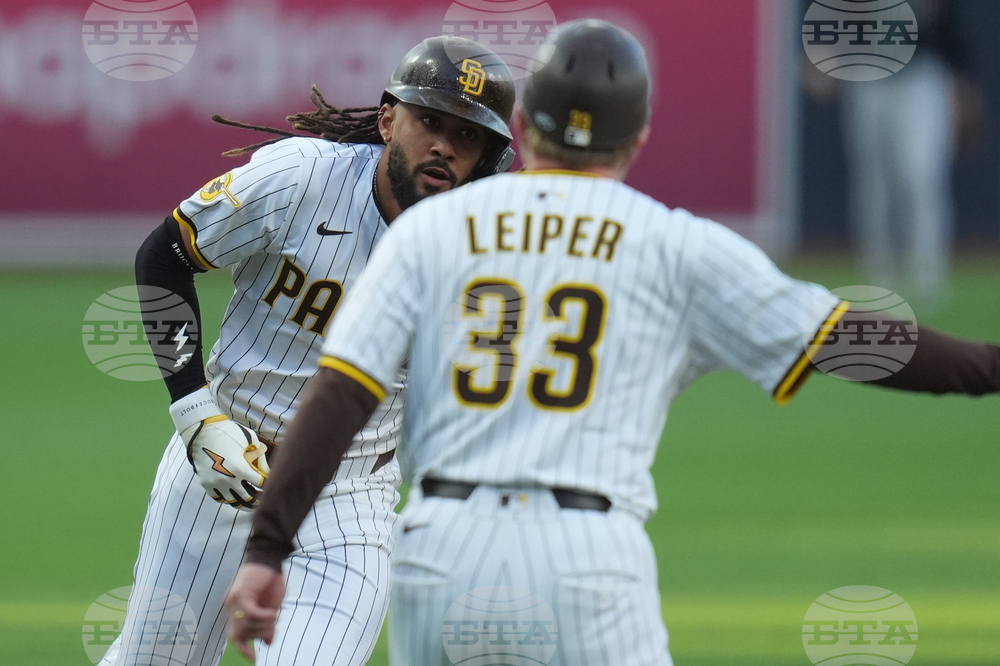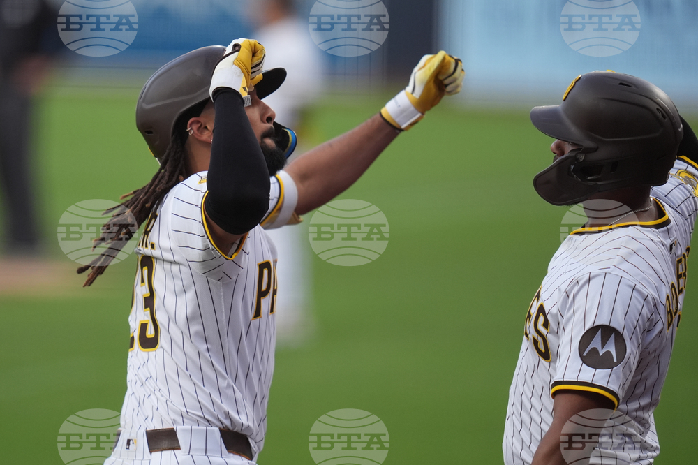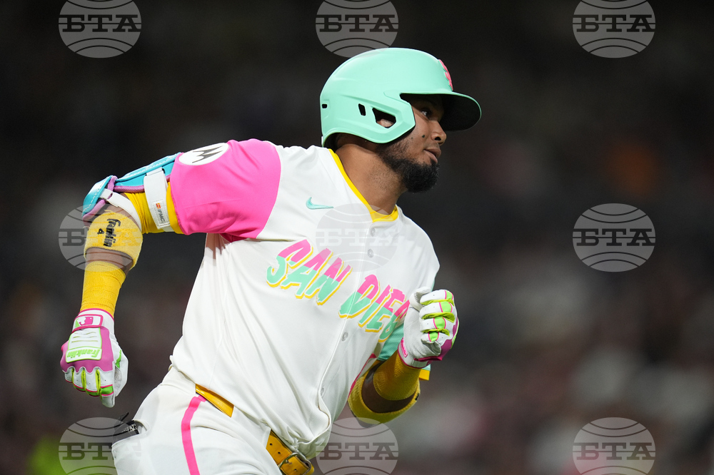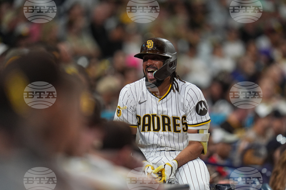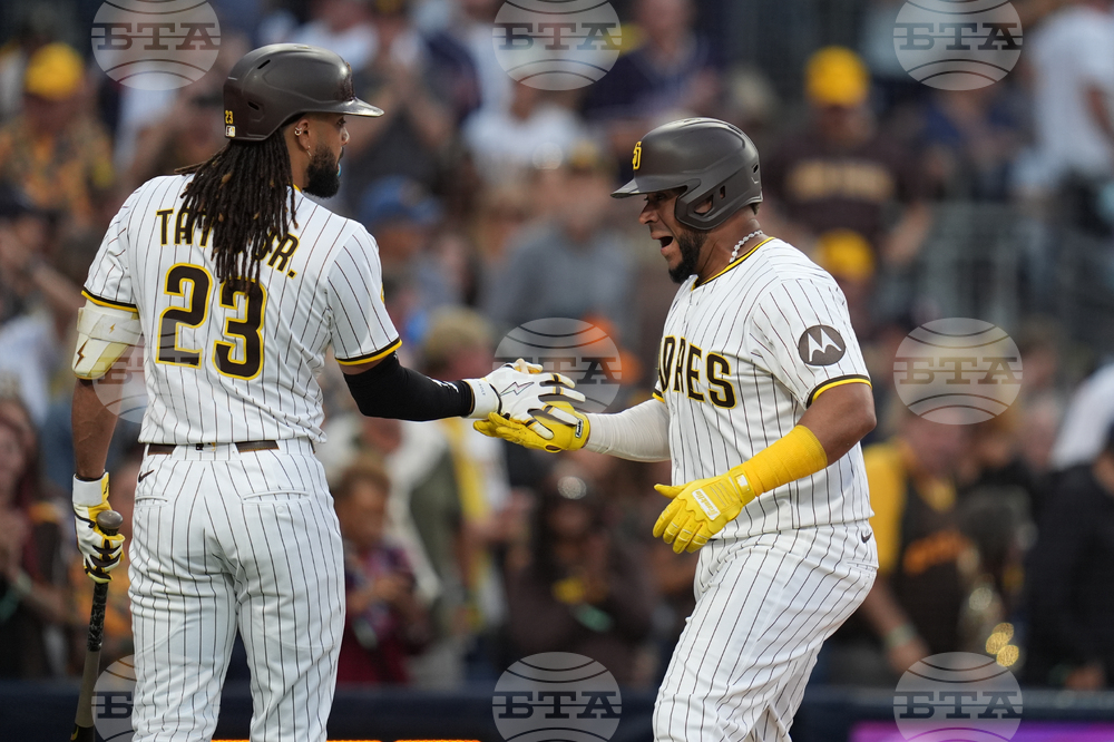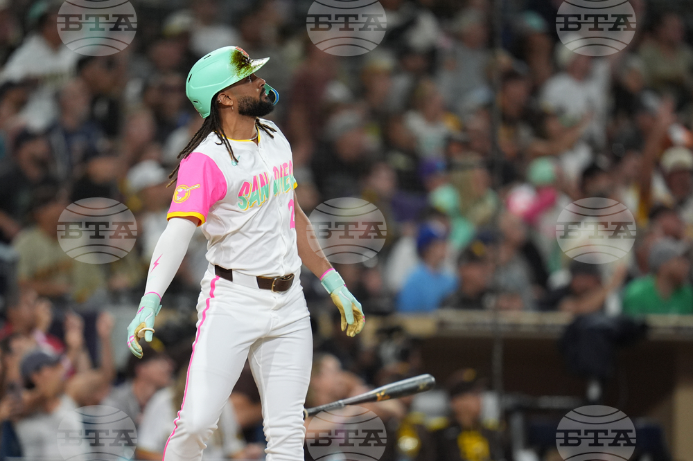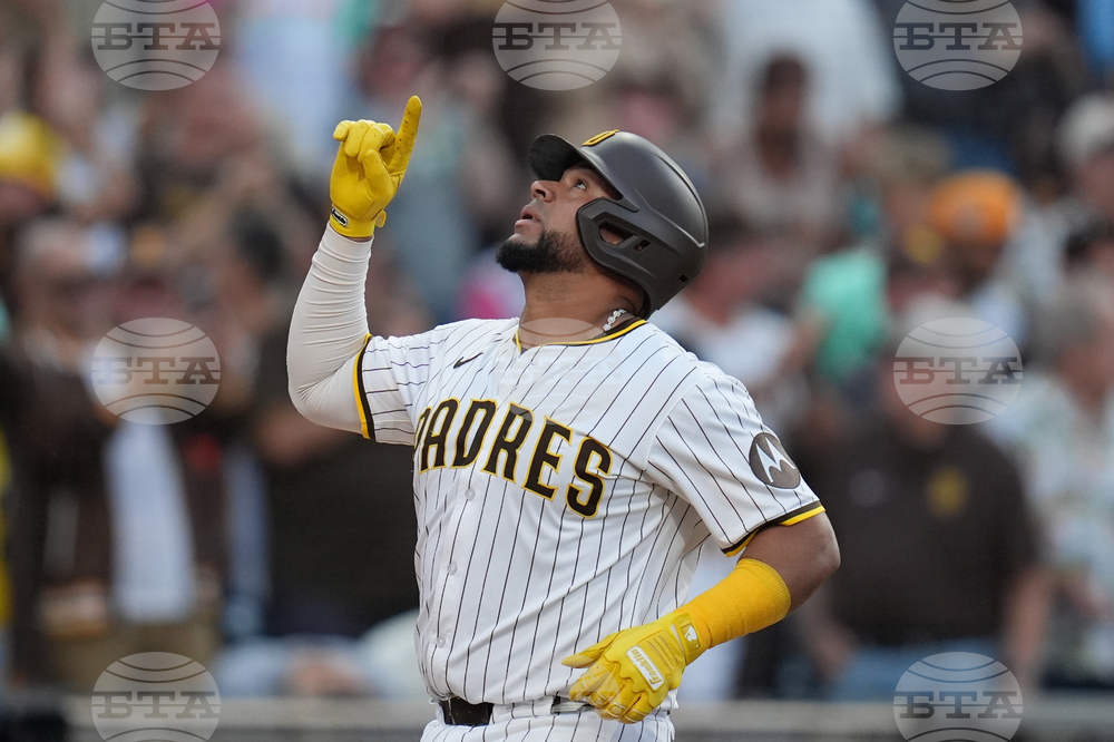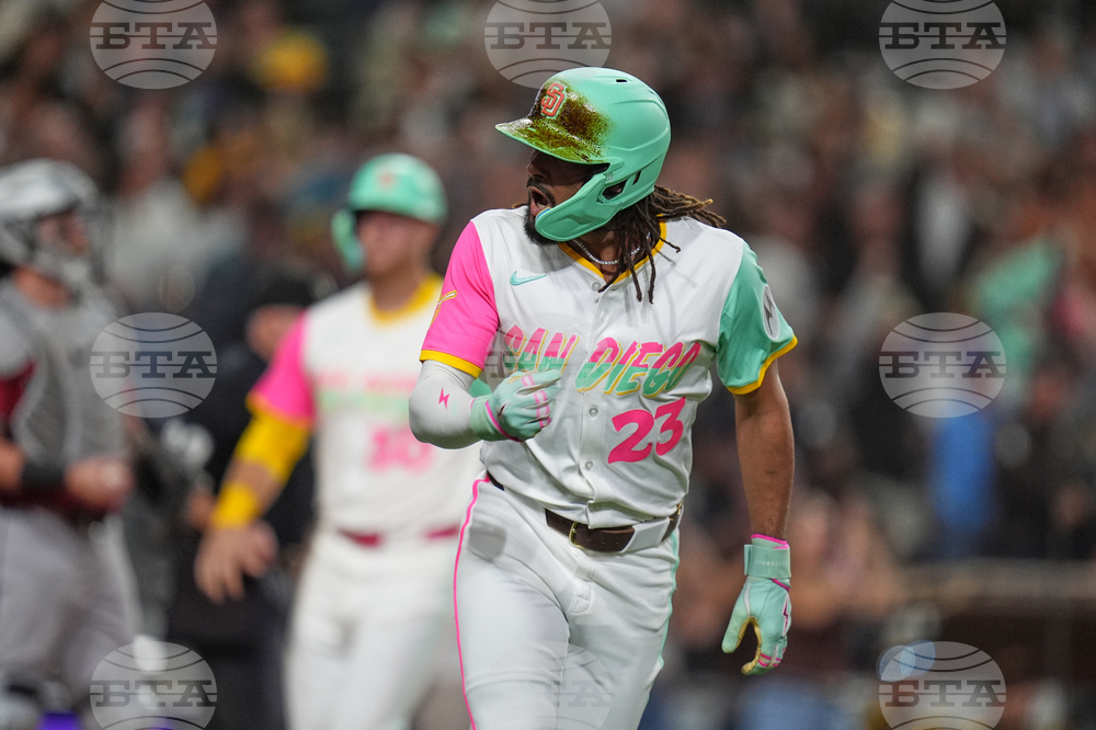 San Diego Padres' Fernando Tatis Jr. hits a grand slam during the fourth inning of a baseball game against the Arizona Diamondbacks Friday, Sept. 26, 2025, in San Diego. (AP Photo/Gregory Bull)