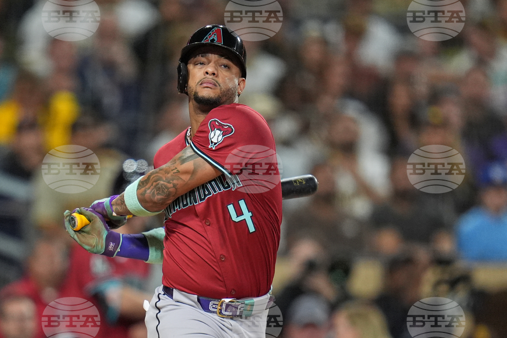 Arizona Diamondbacks' Ketel Marte reacts after striking out during the third inning of a baseball game against the San Diego Padres Friday, Sept. 26, 2025, in San Diego. (AP Photo/Gregory Bull)