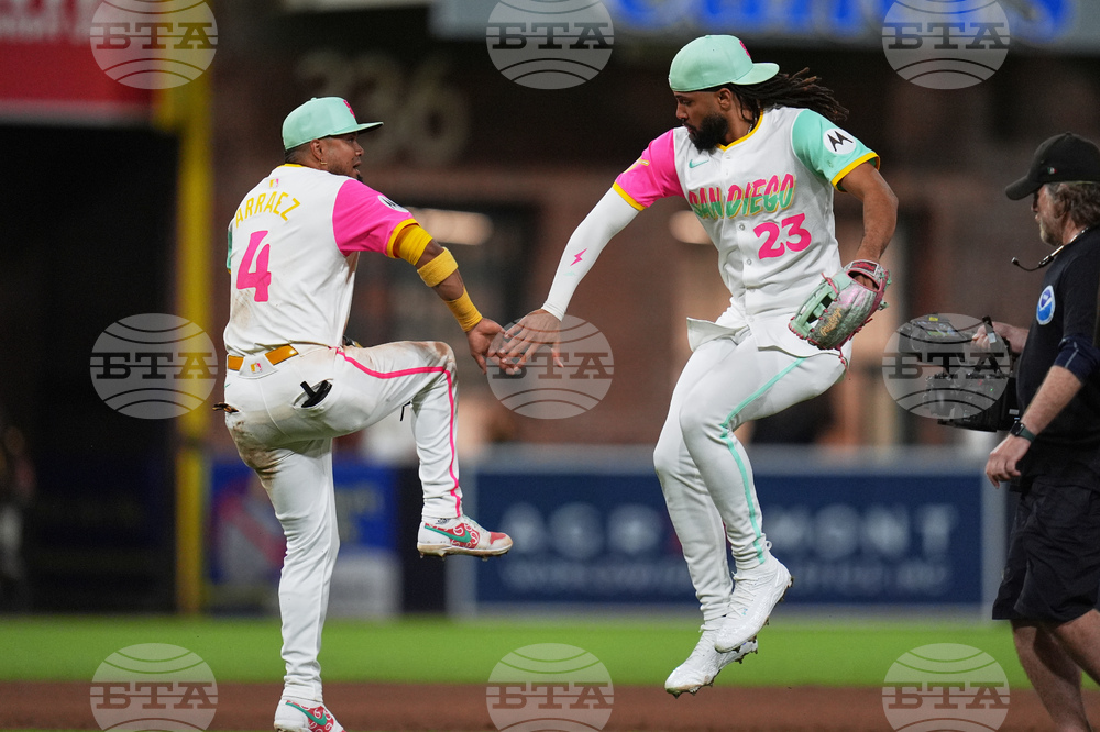 San Diego Padres right fielder Fernando Tatis Jr. (23) celebrates with first baseman Luis Arraez (4) after the Padres defeated the Arizona Diamondbacks 7-4 in a baseball game Friday, Sept. 26, 2025, in San Diego. (AP Photo/Gregory Bull)