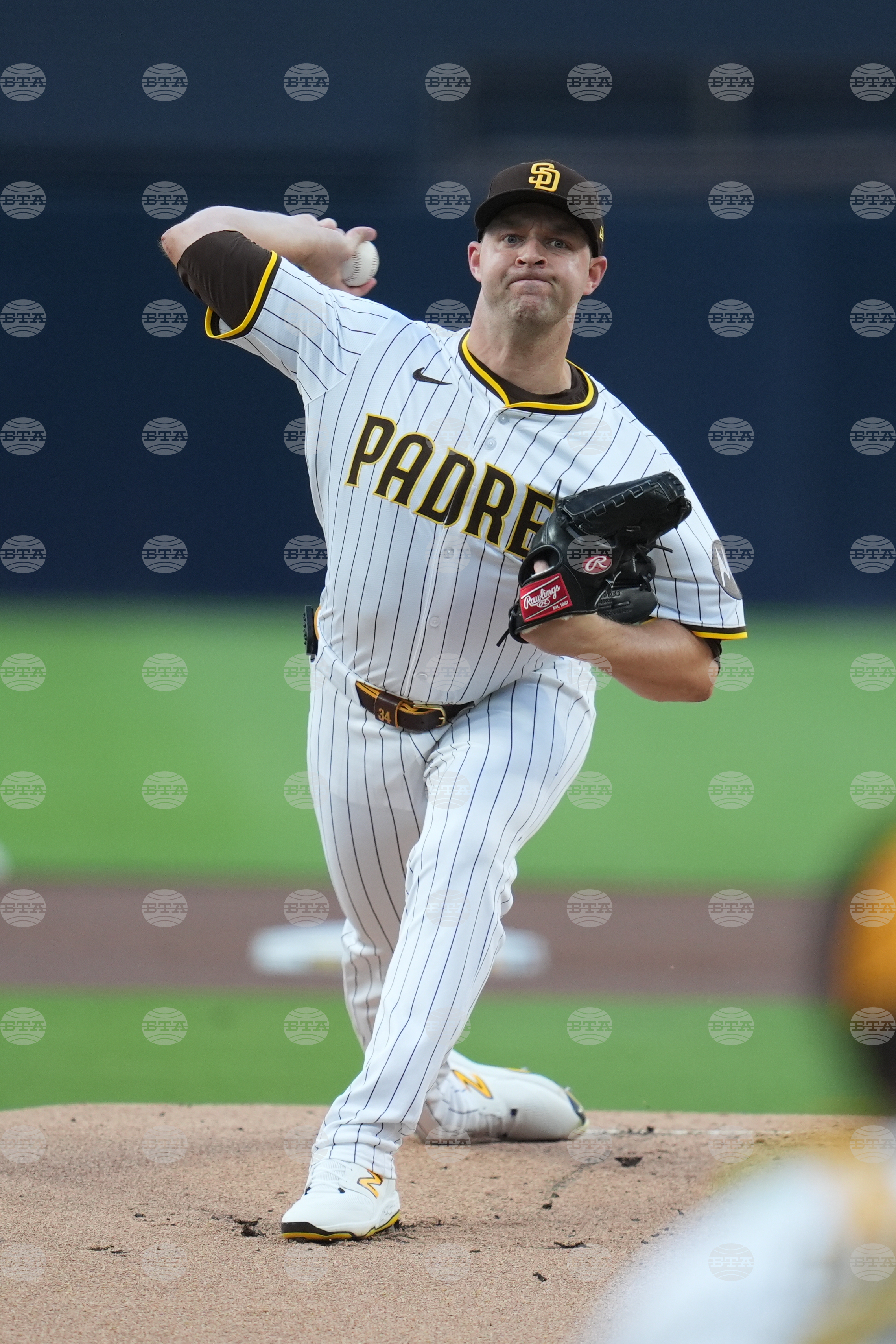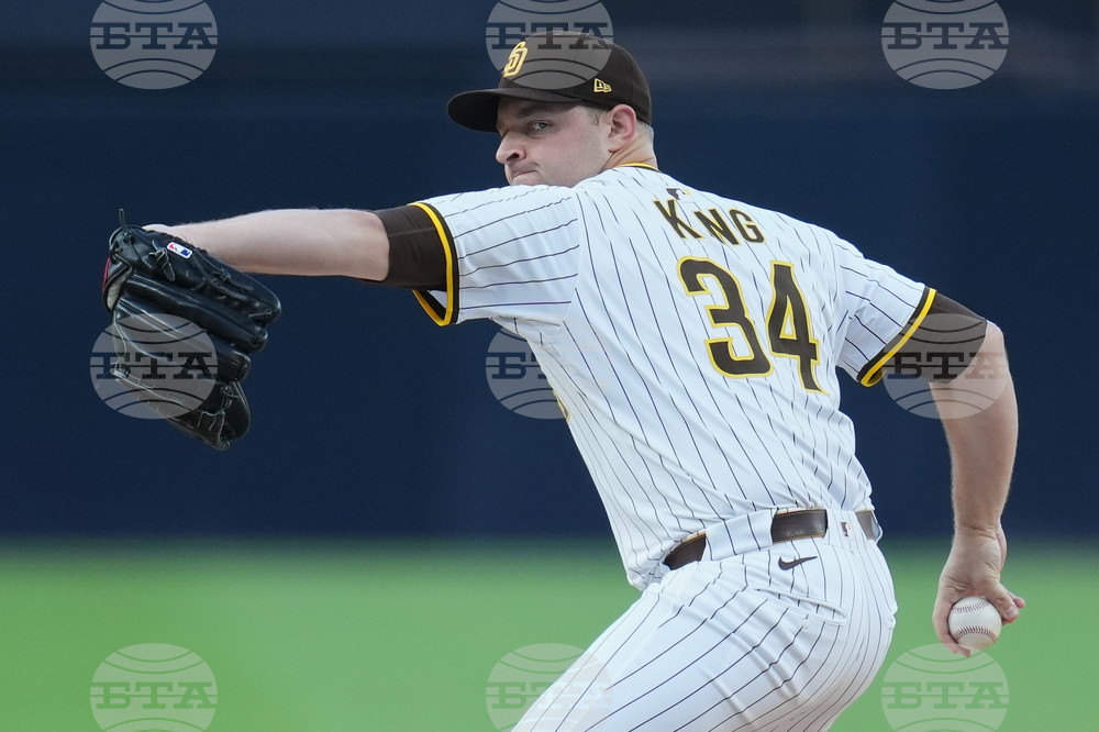 San Diego Padres starting pitcher Michael King works against an Arizona Diamondbacks batter during the first inning of a baseball game Saturday, Sept. 27, 2025, in San Diego. (AP Photo/Gregory Bull)